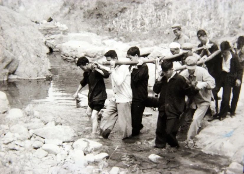 自力更生艰苦奋斗时期,航天科研人员通过肩担人抬,趟过河水,搬运固体发动机进山试验。