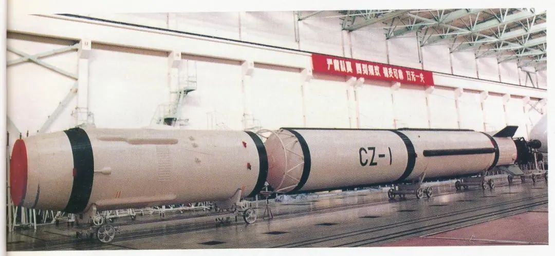 停放在总装车间的我国自行研制的第一种航天运载火箭长征一号。长征一号火箭从1965年开始研制,1970年4月24日成功将东方红一号送入椭圆轨道,中国成为继前苏联、美国、法国、日本之后第五个成功发射人造卫星的国家。