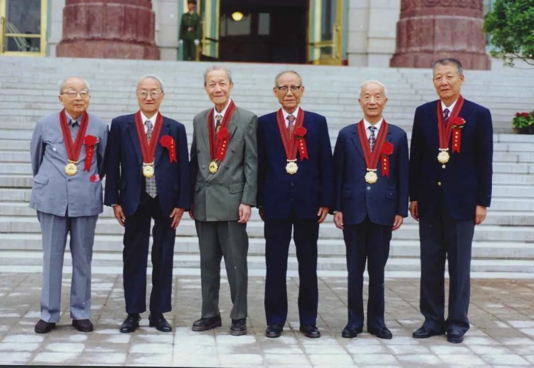 1999年9月18日,屠守锷、杨嘉墀、黄纬禄、任新民、王希季、孙家栋(从左至右)六位院士被授予“两弹一星功勋奖章”后,在人民大会堂外合影留念。新中国成立50周年之际,党中央、国务院、中央军委表彰为研制“两弹一星”作出突出贡献的23位科技专家,授予他们“两弹一星功勋奖章”,凝练形成“热爱祖国、无私奉献,自力更生、艰苦奋斗,大力协同、勇于攀登”的“两弹一星”精神。