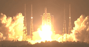 长征五号遥三火箭从塔架起飞。