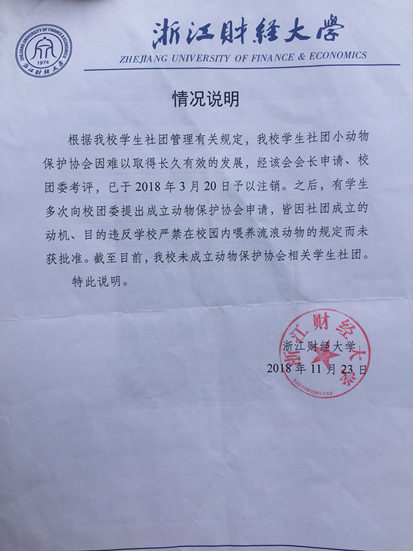 一份发布于2018年11月、盖有浙财大公章的情况说明显示,校园规定严禁在校园内喂养流浪动物。