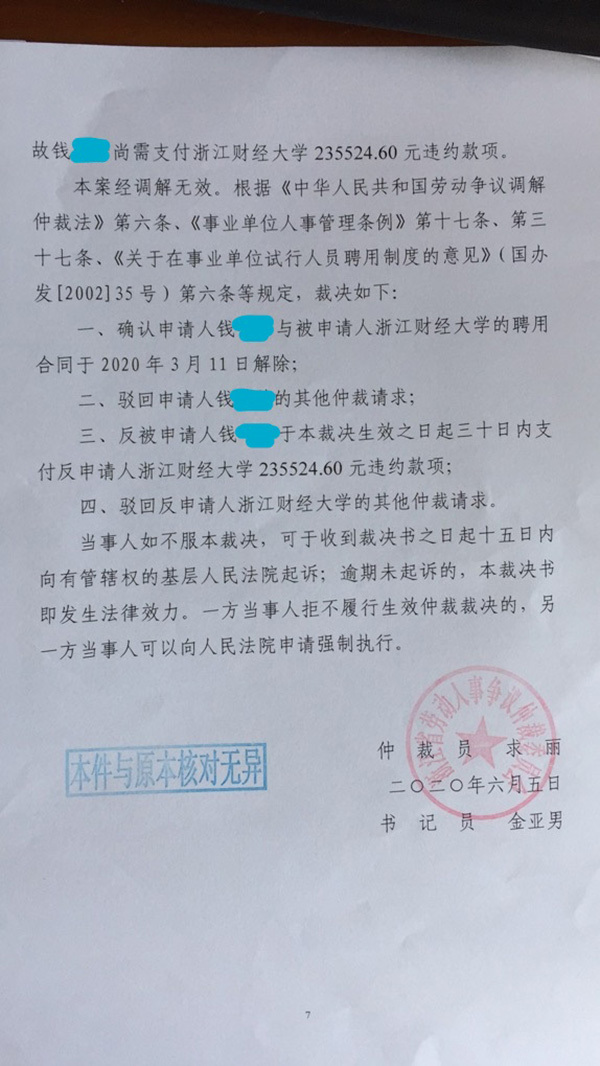 对于钱老师和浙财大的纠纷,近日浙江省劳动人事争议仲裁委员会作出裁决。