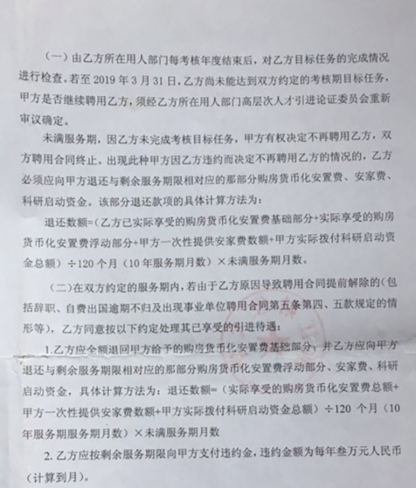 被仲裁委员会认为违约责任过高的条款裁决:服务期义务仍需履行,但违约责任过高 辞职不成,钱老师向劳动仲裁部门申请仲裁。 6月9日,钱老师收到的浙江省劳动人事争议仲裁委员会的裁决书显示,经审理查明,钱老师于2014年1月28日进入浙财大工作,并与学校签订聘用合同。一个月后的2月28日,双方另外签订一份引进高层次人才补充协议,新增承诺服务期十年,并要求若钱老师完成了协议约定的考核目标,将获得引进待遇,包括科研启动经费、安家费、购房货币化安置费等;若其在服务期内辞职,则要退回部分待遇,并按照剩余服务期限支付每年3万元违约金。 2020年2月,钱老师提出辞职时,学校要求其按照补充协议支付违约款项合计55万余元,方可办理离职手续。 钱老师质疑,补充协议与入职前协商的内容不一致,称是在违背真实意愿的情况下签订了协议。她说,当时如不签订协议,则会面临档案“脱节”等风险。 对此,仲裁委员会认为,尽管补充协议与此前约定内容不一致,但签订时间在后,也未发现存在无效或可撤销的情形,因此补充协议有效,钱老师应履行十年服务期义务。 不过裁决书显示,补充协议中的违约责任约定明显过高,有失公平,钱老师无需再另外支付违约金,只需承担剩余服务期内的违约责任即可。根据裁决书,浙财大已向钱老师拨付购房货币化安置费、安家费、科研启动资金共66万,已履行74个月服务期,剩余46个月,另有近2万元科研启动资金尚未领取,抵扣后实际仅需支付235524.6元违约款项。 裁决书显示,2019年5月31日,钱老师首次依据国务院公布实施的《事业单位人事管理条例》第十七条向学校提出辞职,被学校拒绝。2020年2月,她再次提出辞职,至今尚未顺利解除聘用合同。 仲裁委员会认为,依据上述条例第十七条规定,事业单位工作人员提前30日书面通知事业单位,可以单方解除聘用合同。但是,该条例也规定,双方对解除聘用合同另有约定的除外。该纠纷中,双方聘用合同曾约定,钱老师首次提出解除合同后,若双方未能协商一致,应继续履行合同,6个月后再次提出解除合同仍未能与聘用单位协商一致的,可以单方面解除合同。因此,钱老师与学校签订的聘用合同可认定于2020年3月11日(再次提出辞职后双方协商违约款项失败当天)解除。 对于钱老师依据《劳动合同法》要求校方支付“被迫辞职”经济补偿金的仲裁请求,劳动仲裁部门认为于法无据,不予支持。 6月10日,钱老师和学校均表示,将尊重仲裁结果,不会另行起诉。 中国政法大学民商经济法学院副教授金英杰认为,是否同意签订单位的补充协议,是教师的自由权利。如果未完成双方约定,单位便可以要求教师承担违约责任。 劳动法教授王全兴评价称,这种特殊待遇引进人才服务期协议尽管并不罕见,但在现行法律中是缺乏依据的,协议中的违约责任条款也显失公平:“只有不与科研成果或绩效挂钩的特殊待遇,才可以因未完成服务期而按比例退还。此外还要求支付每年3万元的所谓‘违约金’,实质上是罚款,就更不公平。” 他认为,这种试图留住科研人才的方式不可取,既不利于营造凝聚人才的良性环境,也不符合当下事业单位人事制度改革应坚持的促进人才社会性流动的方向。 (应采访对象需求,林逸和张忍堂为化名。)