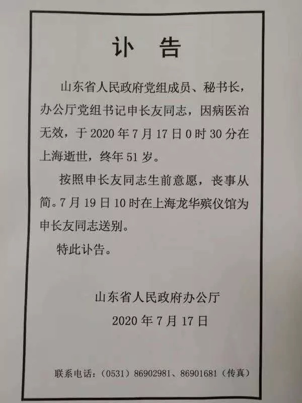 山东省人民政府党组成员、秘书长,办公厅党组书记申长友同志,因病医治无效,于2020年7月17日0时30分在上海逝世,终年51岁。