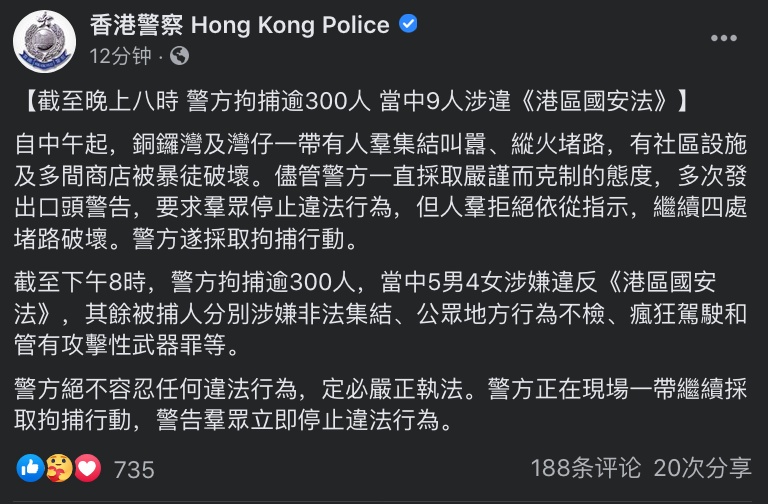 刚刚,香港警察在官方脸书上发布最新通报称,截至20时,警方拘捕逾300人, 其中9人(5男4女)涉嫌违反《港区国安法》 ,其余被捕人员分别涉嫌非法集结、公众地方行为不检、疯狂驾驶和管有攻击性武器罪等。
