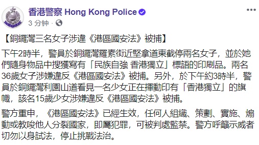 香港警方还称,另外,下午约3时半,警员在铜锣湾利园山道看见一名少女正在挥动印有“香港独立”的旗帜,这名15岁少女涉嫌违反港区国安法被捕。