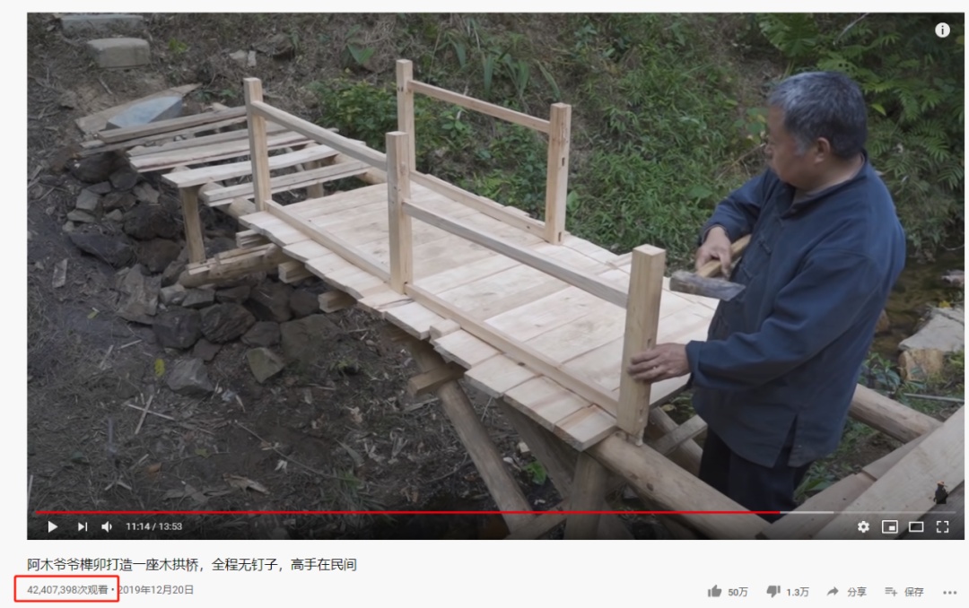 话说,除了李子柒,还有一个中国老大爷也是相当火。最近,一位中国老爷爷徒手做拱桥的视频,在油管上破了4000万的播放。