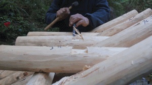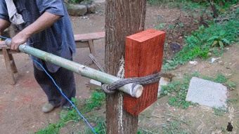 然后把木块固定在树上,沿着标记开锯…