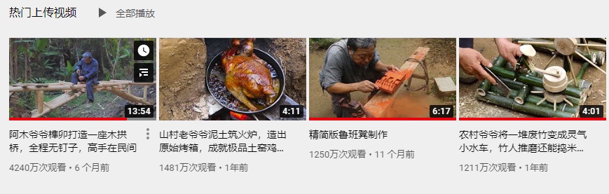 阿木爷爷现在油管的观看量已经超过2亿,订阅人数也达到了117万,6个月前,一个造木拱桥的视频收获了4200多万的观看。