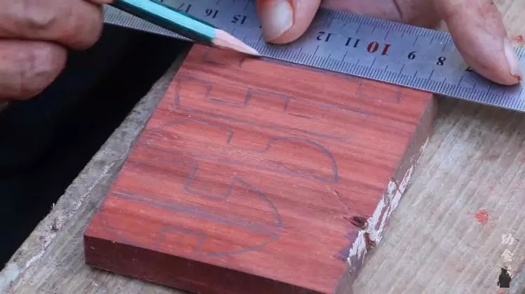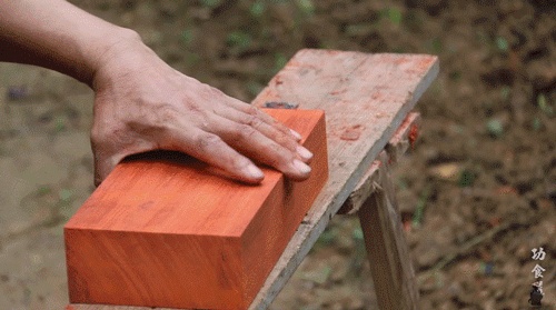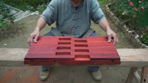 视频中,大爷拿出了一块红木打磨