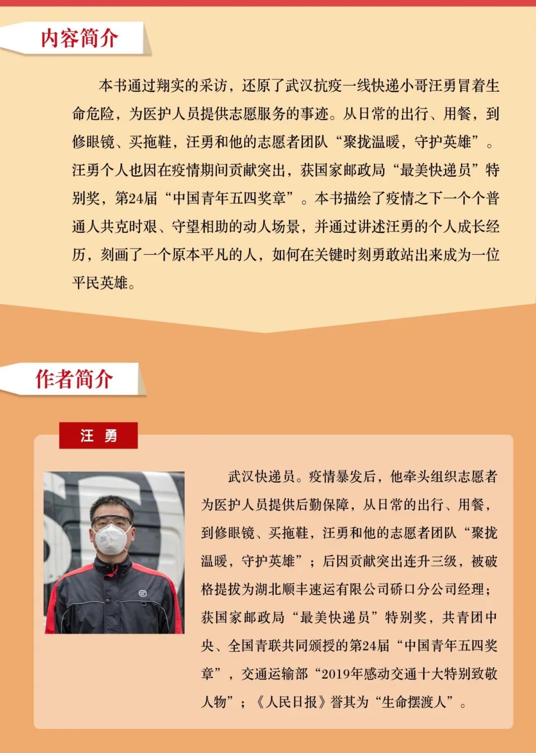“苟利国家生死以,岂因祸福避趋之。”这是武汉抗疫一线快递小哥汪勇的故事,也是疫情期间千千万万个平民英雄的故事。该书以汪勇的故事为出发点,最大限度地还原了真实的武汉,讲述了武汉在疫情最严重时期经历的苦难、付出的代价和做出的英勇抗争的全貌。书中描绘了疫情之下一个个普通人共克时艰、守望相助的动人场景,并通过讲述汪勇的个人成长经历,刻画了一个原本平凡的人,如何在关键时刻勇敢站出来成为一位平民英雄。书中还收录了部分金银潭医院医护人员日记手稿,以最朴素的文字,展现武汉抗疫一线情况,讲述白衣战士的心路历程。