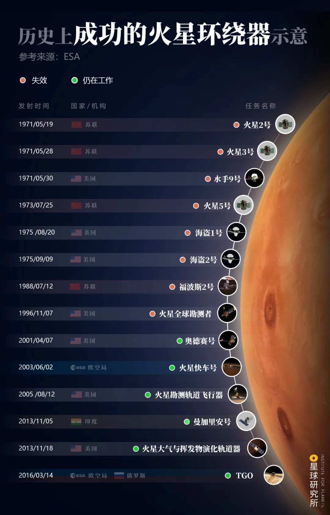 (历史上成功的火星环绕器,如果加上环绕失败和掠飞的案例,数量多达37个,制图@郑伯容/星球研究所)▼