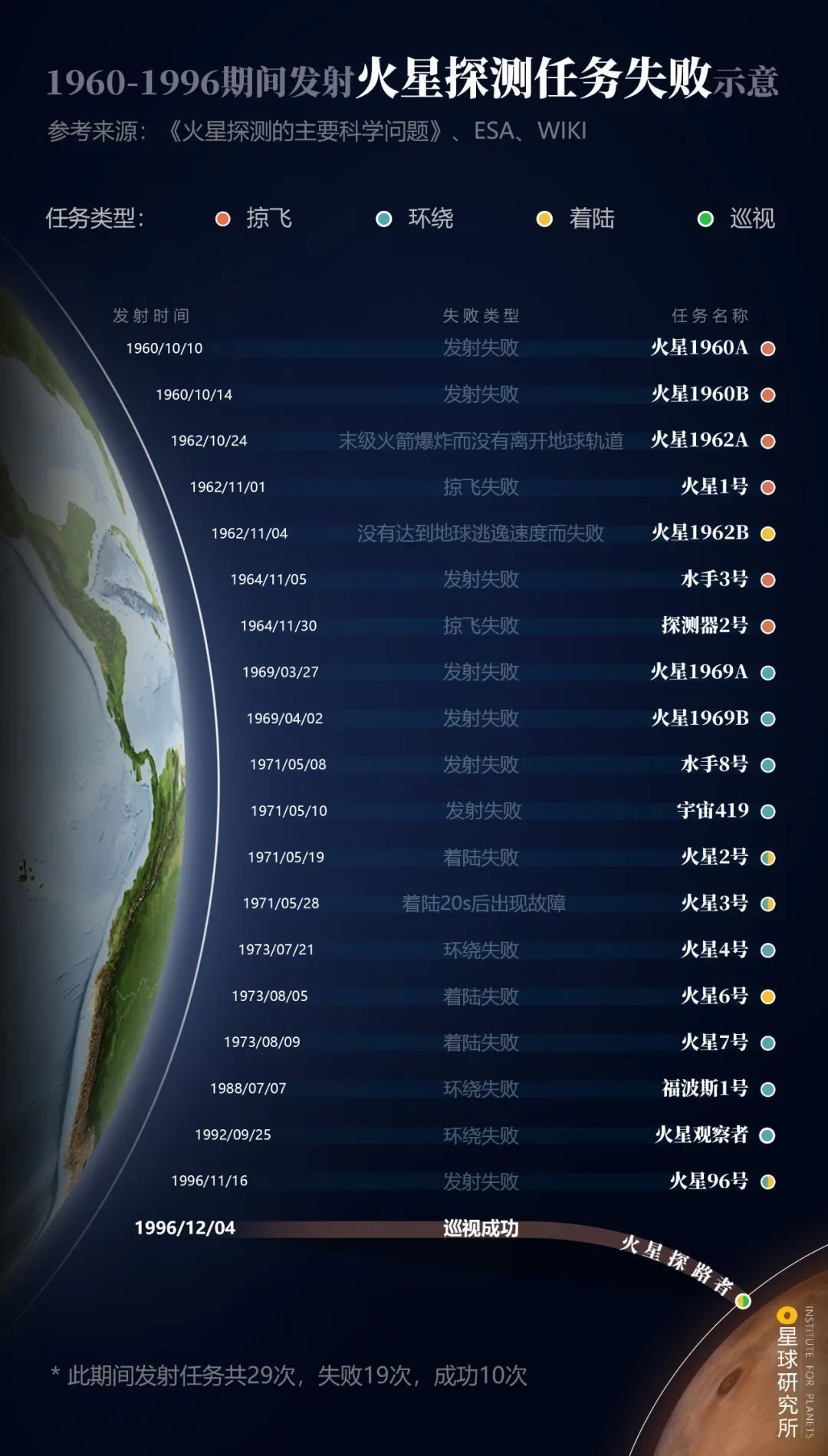 (1960-1996年期间发射的火星探测器失败合集,虽然其中有成功的案例,但直到火星探路者登陆火星,才开启了火星的巡游时代,制图@郑伯容/星球研究所)▼