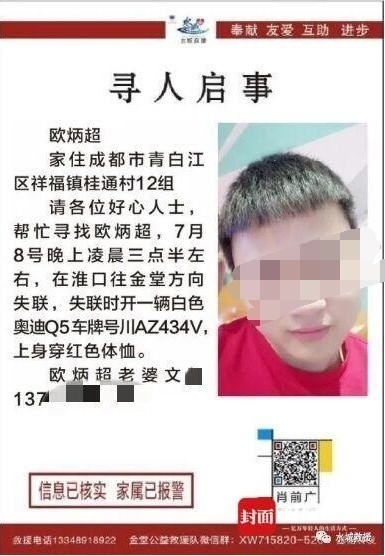 7月7日上午9点,家住成都市青白江区大湾街道的欧炳超消失前的18个小时,妻子文女士并未发现任何异常。