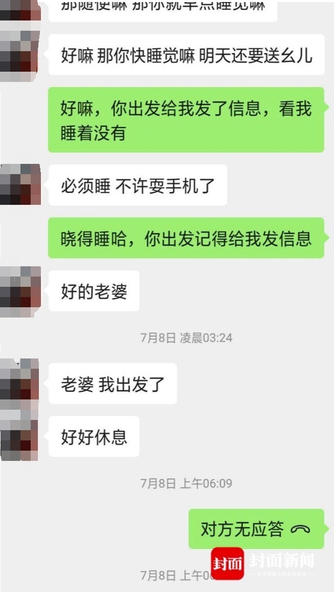 8日凌晨3点24分,欧炳超给妻子发了最后一条微信:“老婆,我出发了,好好休息。”同样收到报平安信息的,还有欧炳超的母亲。凌晨3点过,母亲起夜看到儿子还没回家,发微信询问,得到相同的回复——已经出发。文女士看到消息,已是三个小时后。