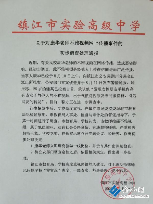 江苏镇江实验高中:不雅视频老师立即调离教学岗位