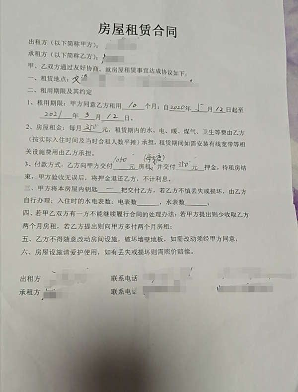 她提供的两张房屋租赁合同显示,她从今年3月起租该房,短租1个月;随后又续租到2021年3月12日。每月租金350元。出租方为王某某。
