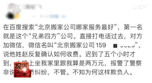 在北京兄弟搬家服务有限公司,公司的法务代表介绍说,他们几乎每天都会接到客户的投诉电话,其中不少消费者都是被强迫交易了高额搬家费后,从市场监管部门的投诉举报热线转过来的。