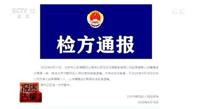 依据《价格法》和《广告法》的有关规定,北京市市场监督管理局朝阳分局对其做出了警告并处合并罚款80万元的行政处罚决定。9月18日,北京市朝阳区人民检察院以涉嫌强迫交易罪对北京四方兄弟搬家有限公司法人代表赵某强等人依法批准逮捕。法律专家解释说,强迫交易罪中最核心的违法行为就是涉嫌实施了“软暴力”。