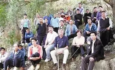 南仁东带领外国专家和工作人员考察大窝凼,并和当地村民合影留念(翻拍照片,2003年10月摄) 。新华社发
