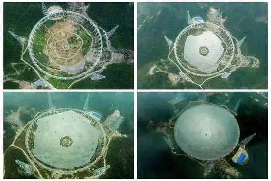 FAST项目从安装第一块反射面板到即将完成的过程。左上:FAST安装第一块反射面板(2015年8月2日摄);右上:FAST反射面板安装近半(2015年12月16日摄);左下:FAST反射面板安装近八成(2016年3月9日摄);右下:FAST反射面板安装完成(2016年7月3日摄)