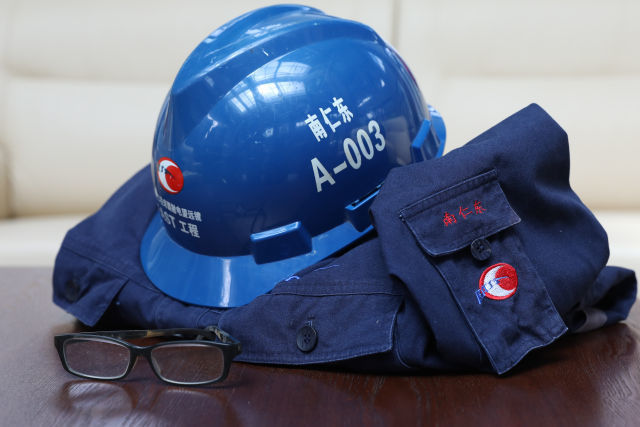 南仁东使用过的安全帽、工作服被工作人员保存在FAST项目控制中心内(2017年9月19日摄)。新华社记者 刘续 摄