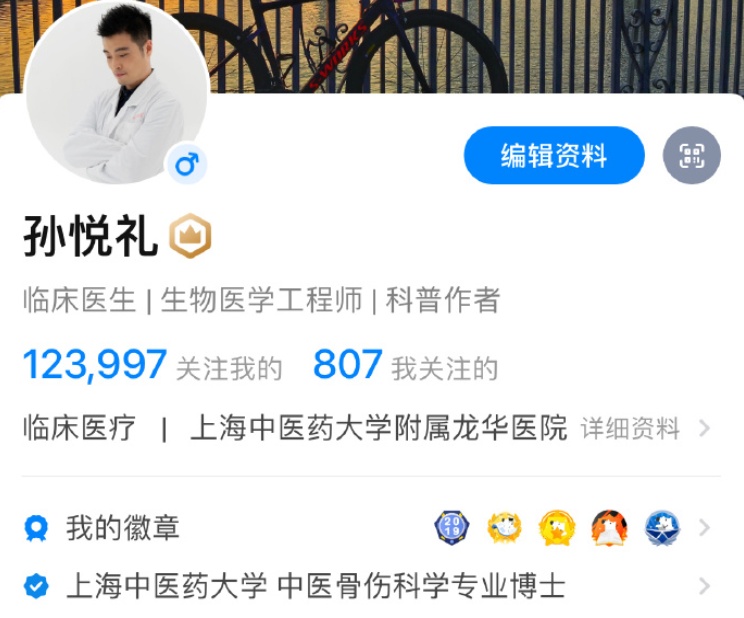 孙悦礼医生的知乎认证为临床医生,上海中医药大学中医骨伤科学专业博士。