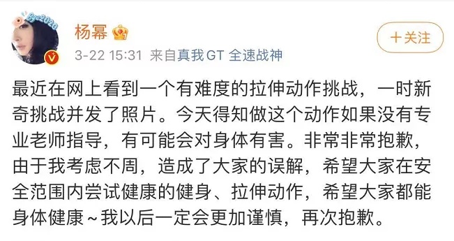 3月22日下午,发起挑战的杨幂在微博上道歉,“由于我考虑不周,造成了大家的误解,希望大家在安全范围内尝试健康的健身、拉伸动作……”