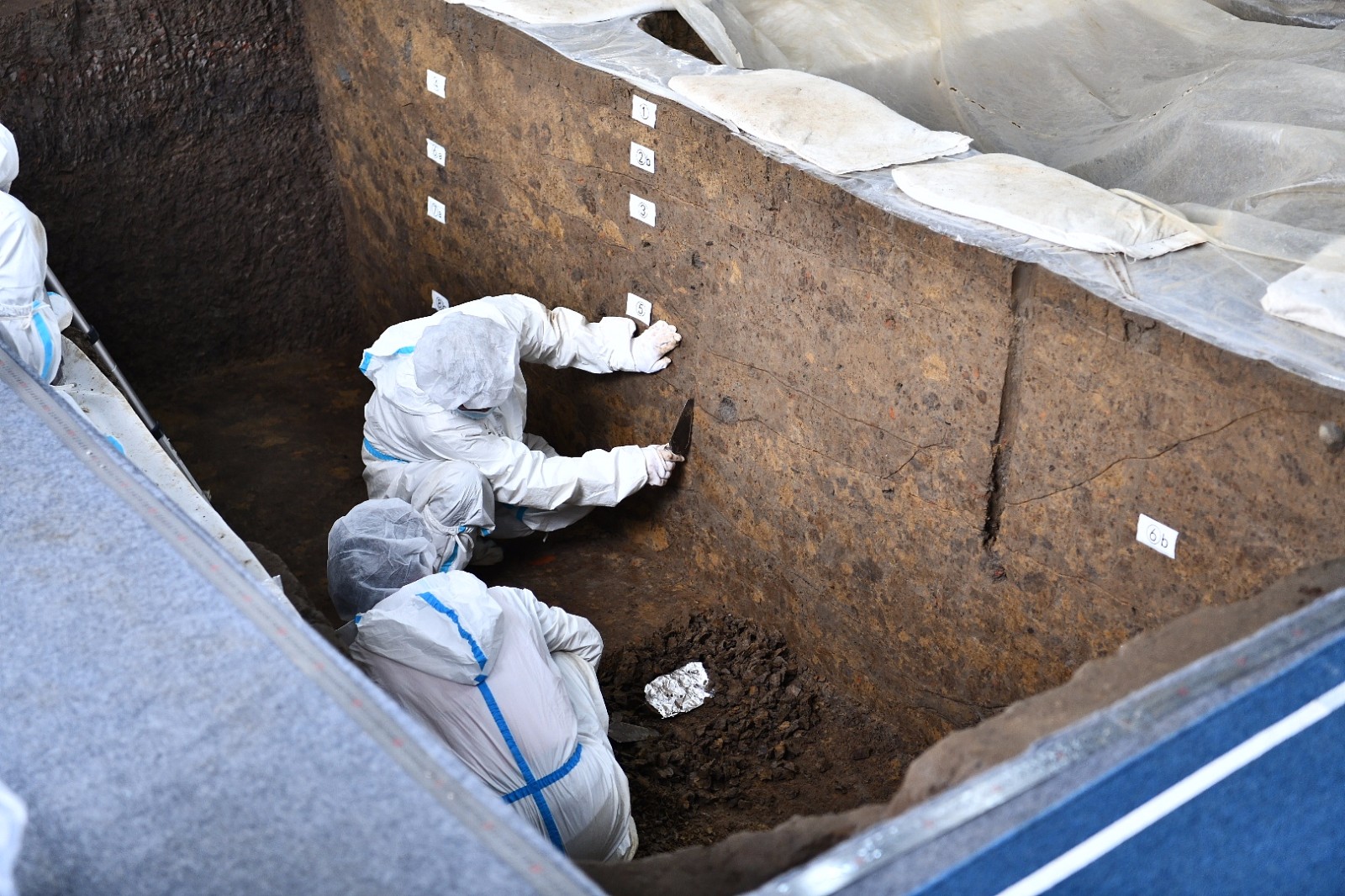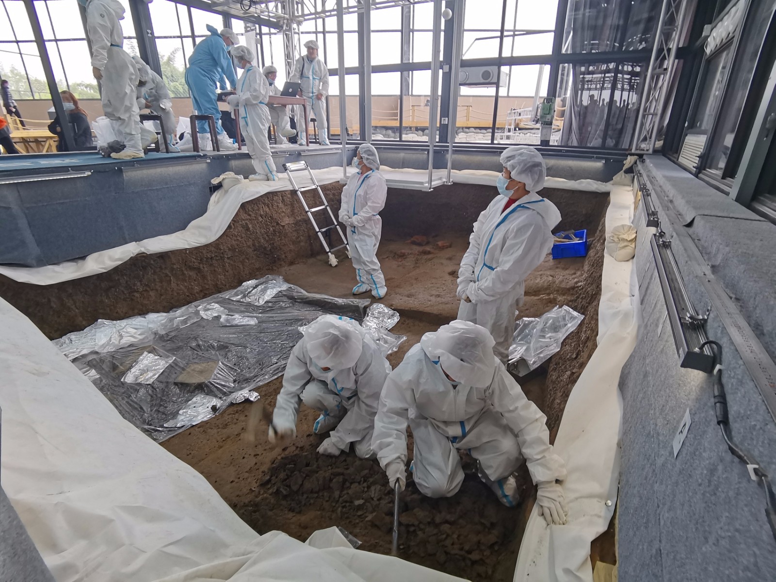 2021年3月24日,四川德阳广汉,实地探访三星堆遗址发掘现场。考古人员在发掘舱内工作。此次的发掘工作除了一些传统工具之外,还引入了一些“黑科技”:携式X射线荧光、扫描电镜、超景深显微镜……甚至从探方里挖出的泥土,都要取样装袋打上二维码进行存档,就像是给泥土也制作一张属于它们的身份证。