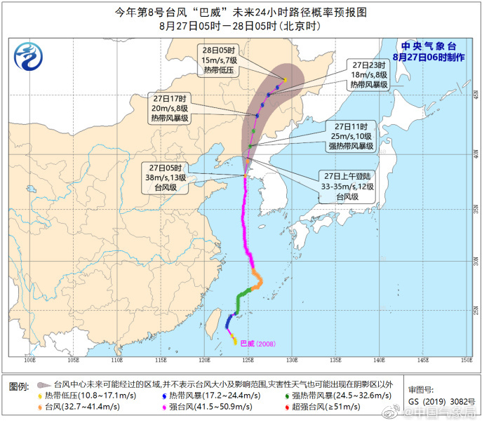 今年第8号台风巴威的中心已于今天8时30分前后在中朝交界附近的朝鲜平安北道沿海登陆,登陆时中心附近最大风力有12级(35米/秒),中心最低气压为970百帕。