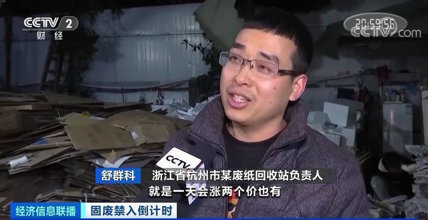 浙江省杭州市某废纸回收站负责人舒群科:有些时候一天会涨两个价,基本上每吨30元-50元之间,每个家庭都不舍得扔了,基本都到我们收购站里来了。