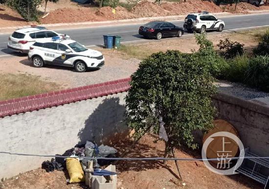 8月19日,警方车辆停放在乐安县山砀镇山砀村,警方人员正在对曾春亮案进一步调查。摄影/上游新闻记者 肖鹏
