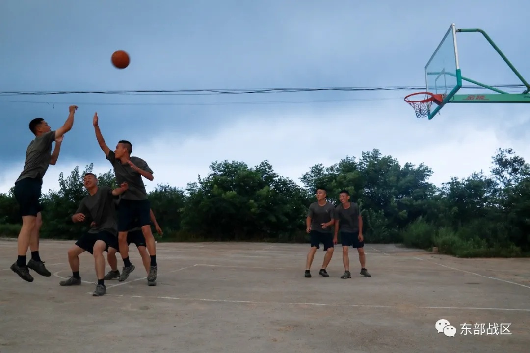 冒小驰与战士们一起打篮球。