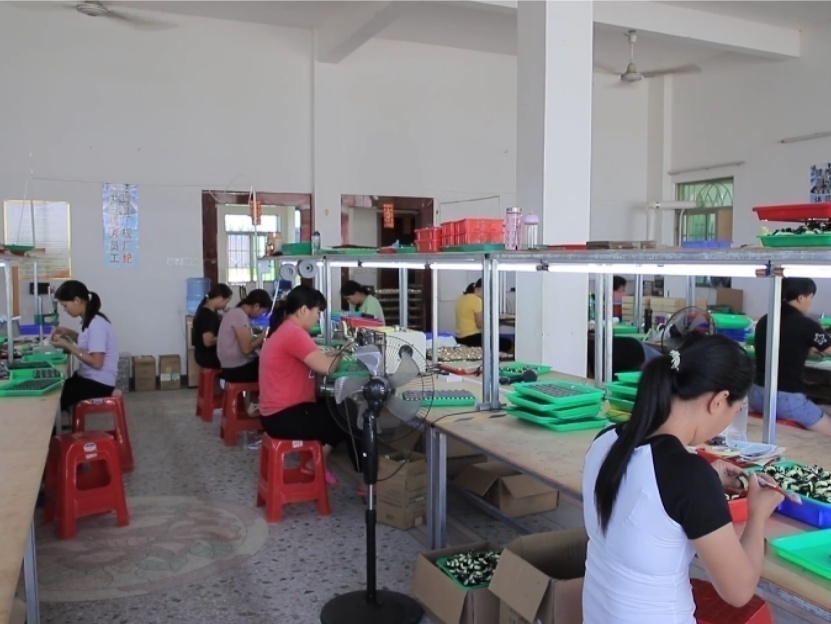 这是湖中村今年五月新引进的梅州市环艺电子加工厂扶贫车间。目前车间内有近三十位工人,且多为女性。工人们的主要工作内容是电子零件的检测、拆卸、组装、焊接等基础工作,每日工作八小时。