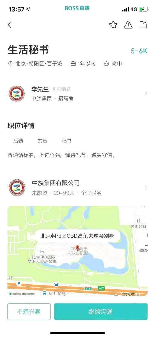 BOSS直聘平台上,中族集团有限公司正在北京地区招聘“生活秘书”。该职位要求应聘者学历在高中以上,工作经验“1年以内”,工作内容描述为“普通话标准,上进心强,懂得礼节,诚实守信”,月薪5000-6000元。