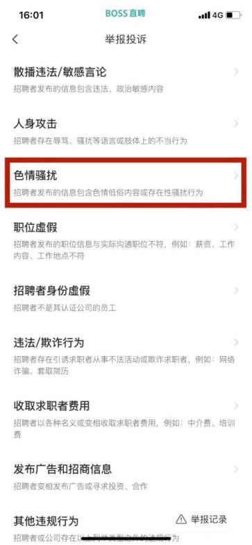 BOSS直聘页面中的举报功能。软件截图