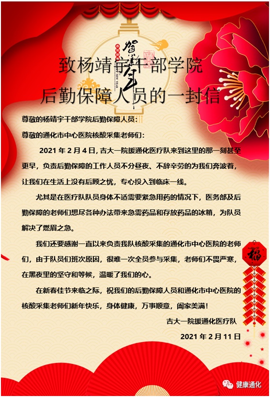 2月11日,通化市新冠肺炎救治定点医院收到吉大一院援通医疗队《致杨靖宇干部学院后勤保障人员的一封信》,对医院在抗击疫情一路以来的支持,积极做好医疗队的后勤保障工作表达真诚的感谢。信中写道:“感谢负责后勤保障的工作人员不分昼夜、不辞辛劳的为我们奔波着,让我们在生活上没有后顾之忧,专心投入到临床一线。”