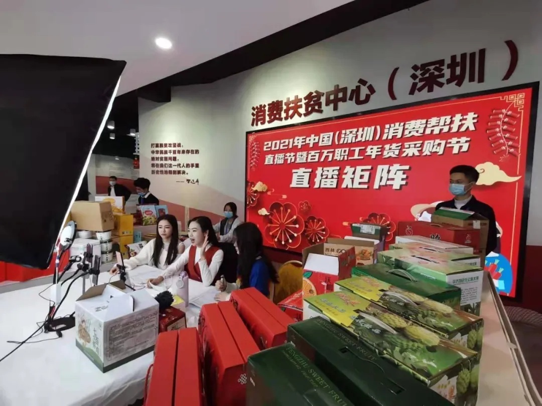 创新举措缓解疫情期间农产品滞销难题。新冠肺炎疫情发生后,深农集团旗下32家农批市场精准防控,未发生一例疫情事件。其中,年车流量超500万台、人流量超1000万人次的深圳海吉星市场,在疫情防控形势一度紧张的情况下,确保了深圳菜篮子的安全与稳定,为消费扶贫中心营运提供了坚强保障。深圳对口地区农产品因疫情一度严重滞销,深农集团积极结合保供稳价需求,分类施策,通过建 立产销对接群、线上商城销售、直播带货、扫码一件代发等创新举措,大力缓解深圳对口地区产品滞销难题,促进销售水果等农产品2000吨以上,直播带货销售1.8万多笔,7294名贫困人口受益。