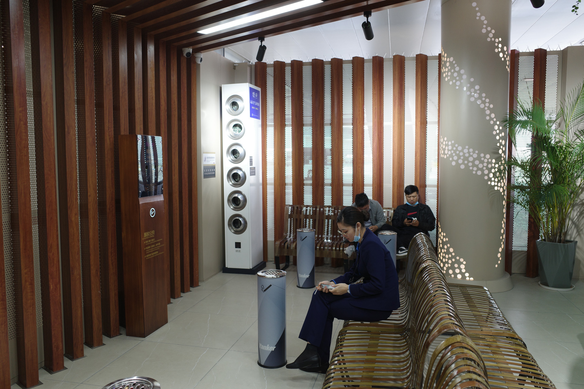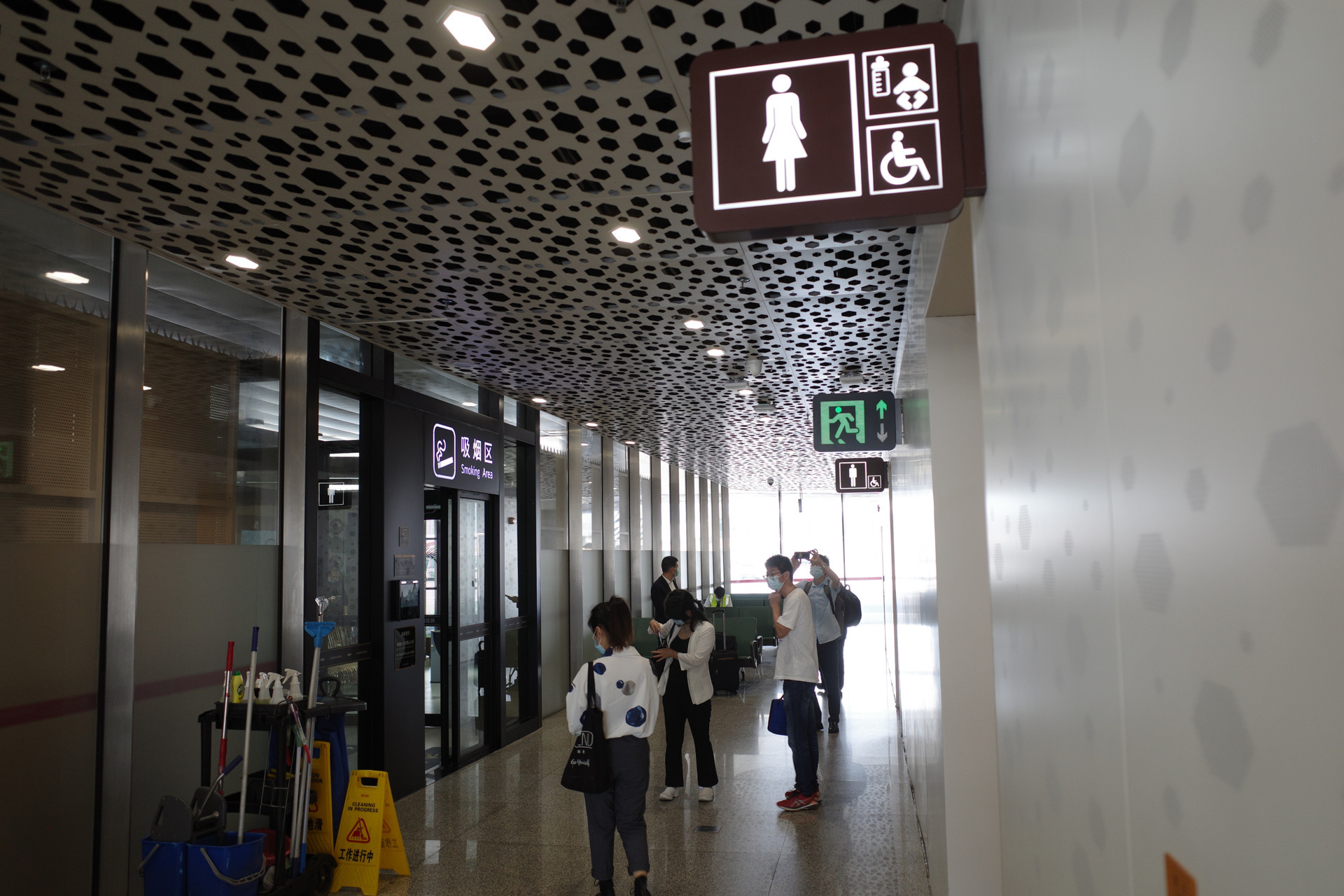 100多平米的面积,树立着16根灭烟柱,还有自动点烟装置。在深圳宝安国际机场T3航站楼70号登记口附近有着一个豪华吸烟室,而在吸烟室对面,就是母婴室。