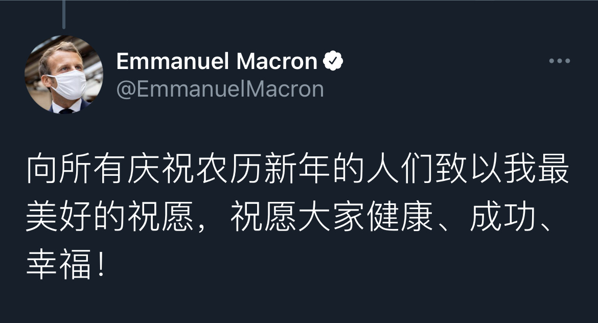 马克龙在社交媒体用中文拜年:“祝愿大家健康成功幸福!”
