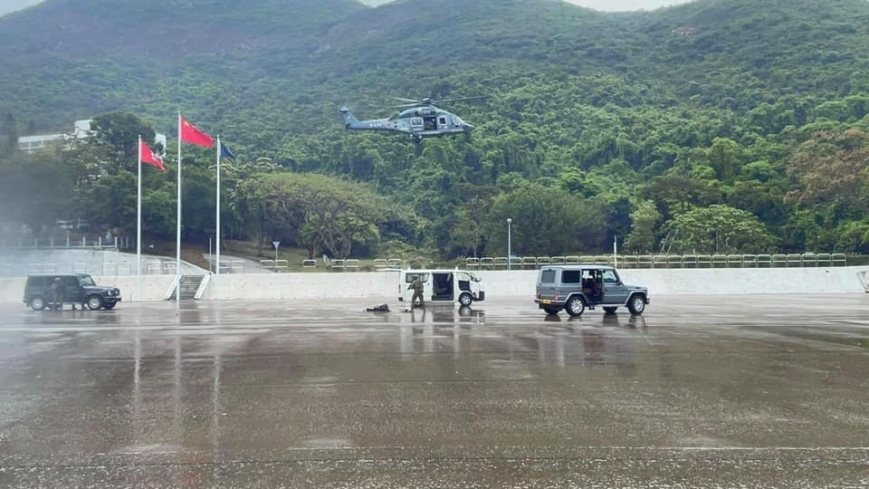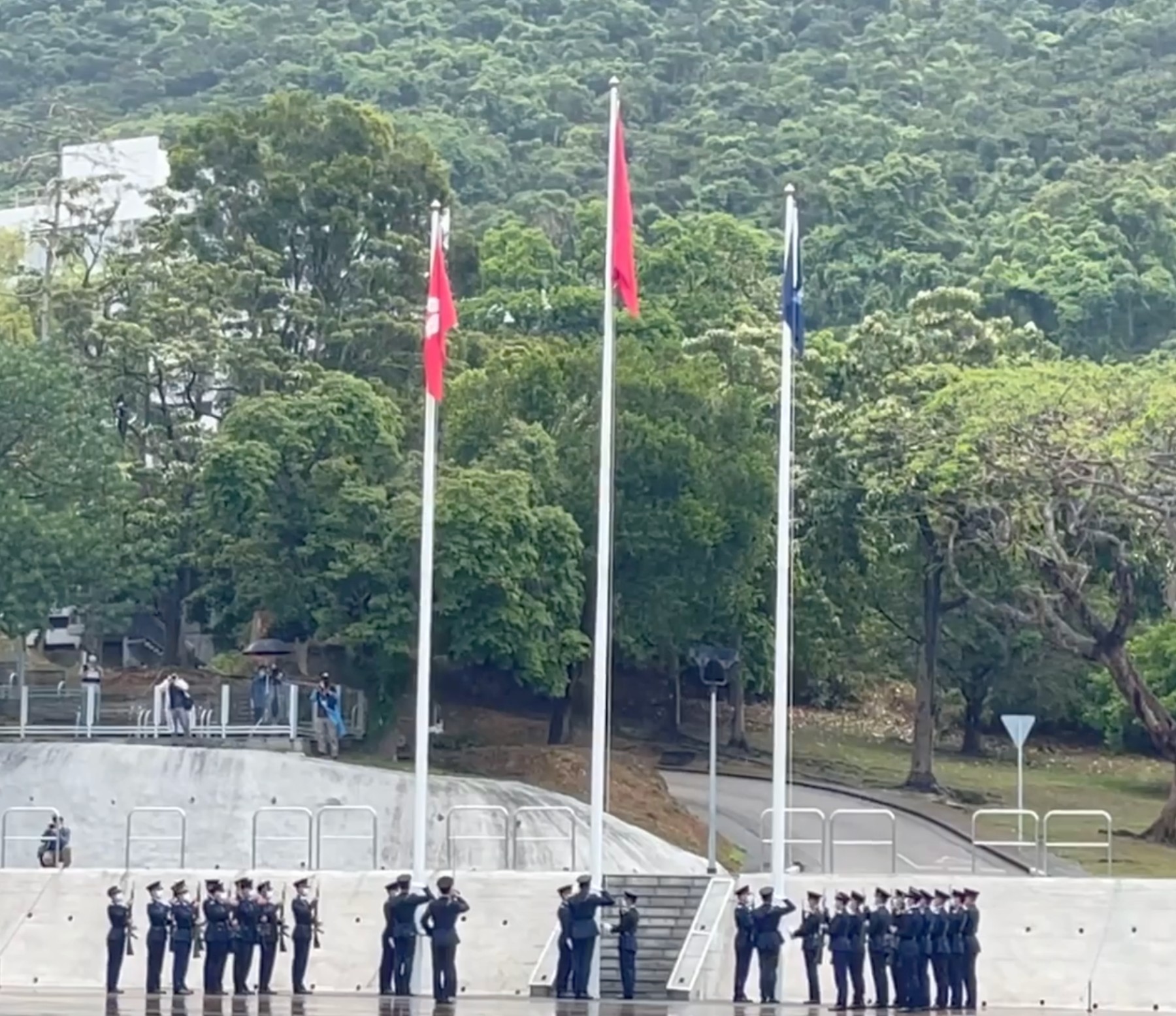 “向右看齐”“齐步走”“提枪”“立正”……配合着音乐,步操仪仗队行进中还表演了多次转枪、变换队形等动作。最后,伴随着响亮的口号“香港警察,忠诚护国安,勇毅保家安”,仪仗队表演结束。观众席上,立即传来阵阵热烈的掌声。