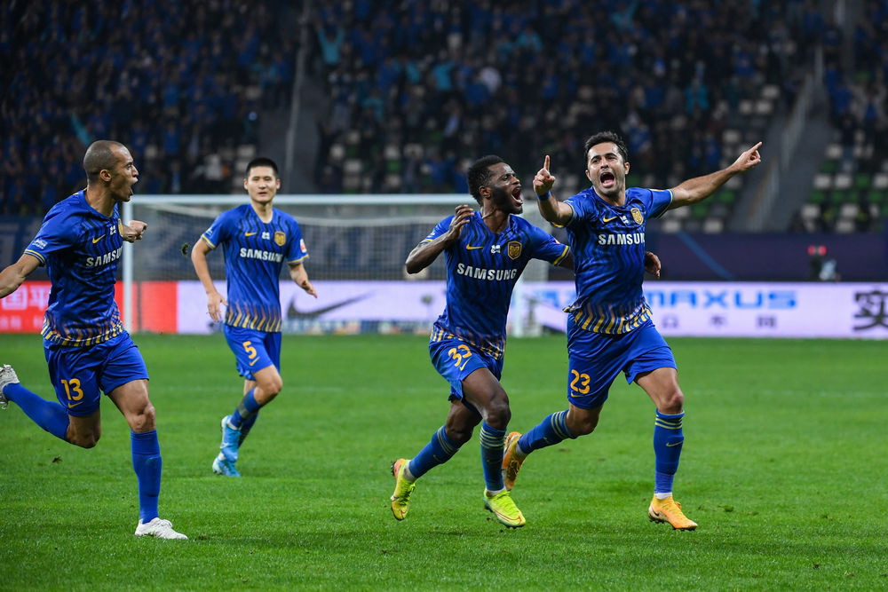 11月12日,江苏苏宁队球员埃德尔(右一)进球后庆祝。新华社记者李博摄