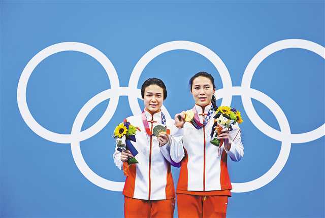7月25日,中国选手施廷懋(左)和王涵在颁奖仪式上。当日,在东京奥运会跳水女子双人三米跳板决赛中,施廷懋/王涵夺得冠军。新华社记者许畅摄