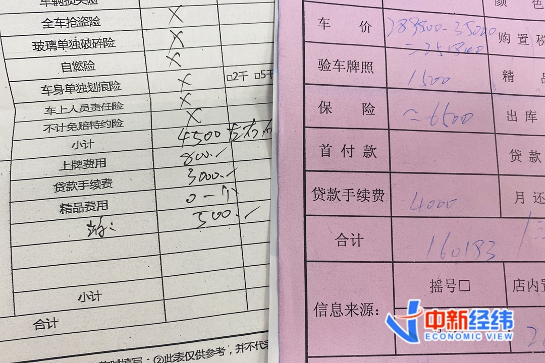 走访过程中,中新经纬客户端以一辆14万元左右的轿车进行询价,北京朝阳区一家吉利4S店销售推荐的方案为首付6万元,两年免息,贷款金额近8万元。预算表上除去购置税、保险等费用,还有一笔3000元的“贷款手续费”。