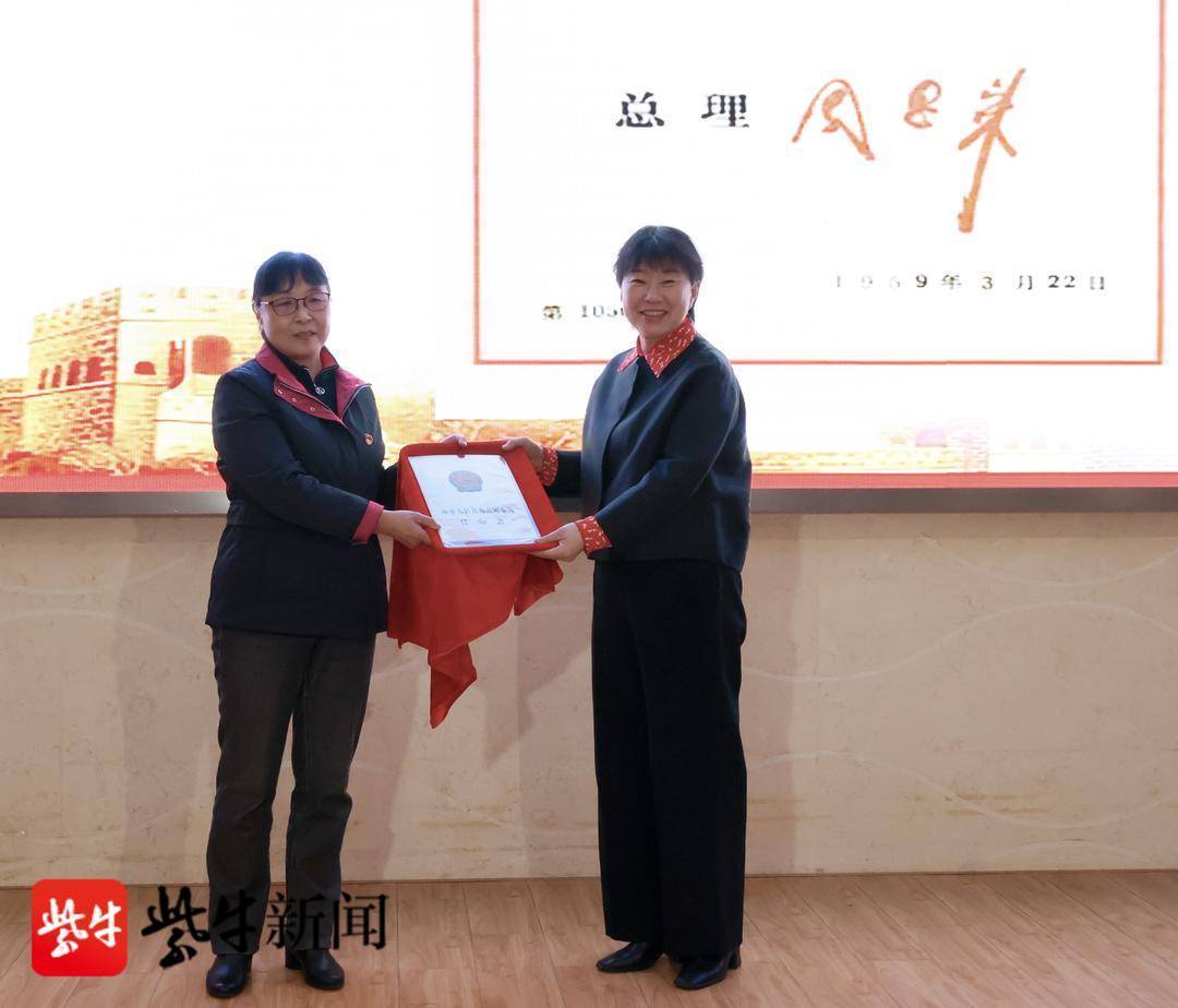 秦志红将由周恩来总理签发、秦华礼任南京邮电学院院长的任命书捐赠给学校,南京邮电大学校长叶美兰(右)接受捐赠