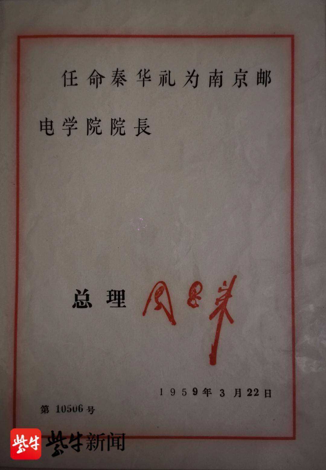 由周恩来总理签发,秦华礼任南京邮电学院院长的任命书