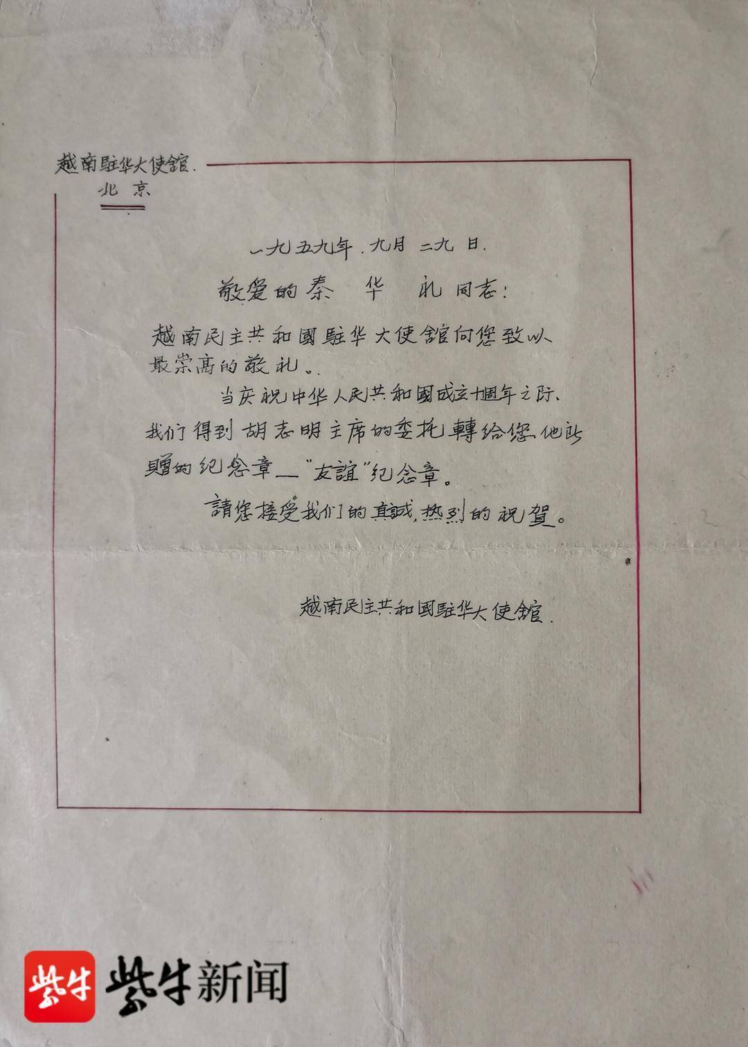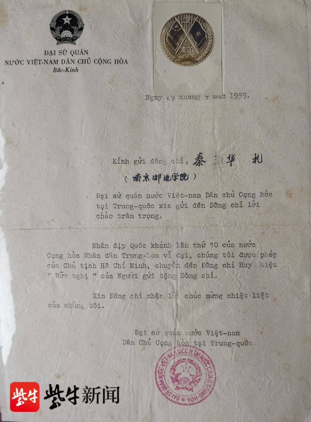 除了替父亲交纳特殊党费,秦志红还将5件具有重大历史意义的遗物捐赠给南京邮电大学,其中包括:由周恩来总理亲自签发的秦华礼任南京邮电学院院长的任命书;因成功培养越南留学生,1959年越南劳动党胡志明主席颁发给秦华礼的一枚“友谊”纪念章;上世纪八十年代,秦华礼编织的1双草鞋;他荣获的第五届“江苏慈善奖”最具爱心慈善行为楷模的荣誉证书和奖杯。