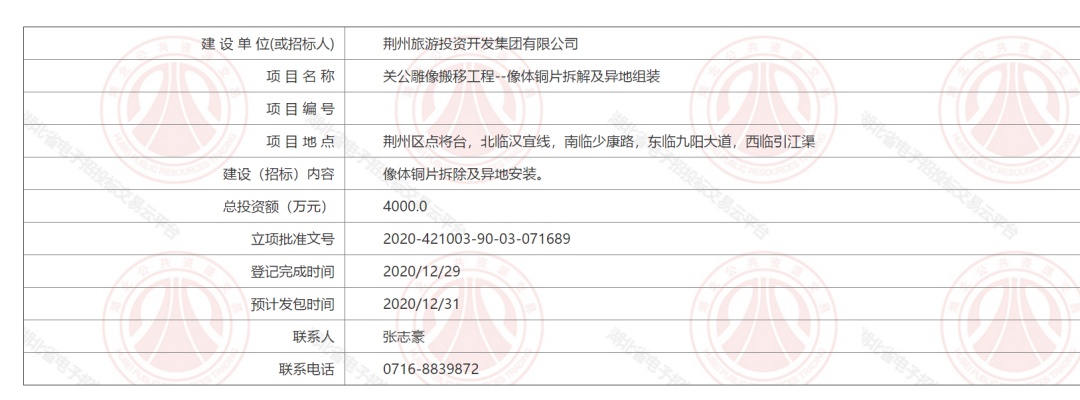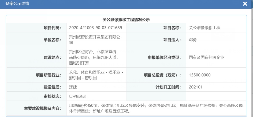 据湖北省投资项目在线审批监管平台显示,荆州区发展和改革局2020年12月17日批复的“关公雕像搬移工程”已审核通过,项目总投资为15500万元,计划开工时间为2021年1月。该工程主要建设规模及内容包括:雕像用地面积约50亩,像体铜片拆除及异地安装;像体内骨架拆除;原址基座及广场修整;关公基座及像体骨架重建;新址广场及景观工程。