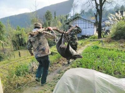 11月6日,四川省通江县一次野猪猎捕行动中捕获的野猪