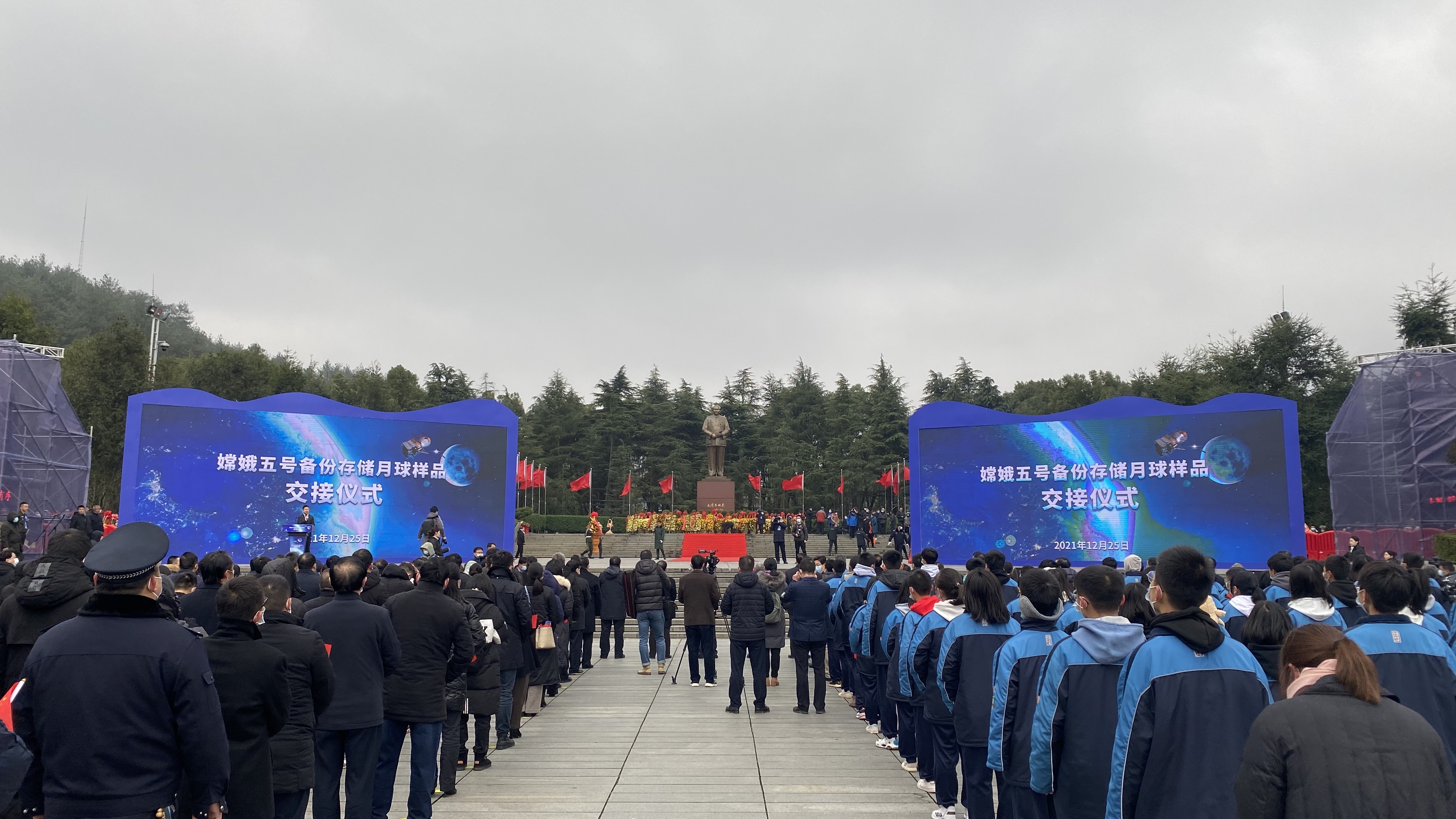 12月25日上午,“嫦娥五号备份存储月球样品交接仪式”在韶山举行。仪式于当日上午9时30分举行,与会领导和嘉宾向毛泽东铜像敬献花篮,来自韶山的学生代表齐诵原创主题诗歌《九天揽月 如您所愿》,国家航天局向湖南大学、韶山市颁发嫦娥五号月球样品备份证书和嫦娥五号任务展品证书。活动现场气氛热烈。